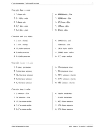 Conversiones de UnidadesLineales 2 Convertir: dias ⇐⇒ min 1. 3 d´ıas a min 2. 2,15 d´ıas a min 3. 5 d´ıas a min 4. 0,91 d´ıas a min 5. 0,45 d´ıas a min 6. 489000 min a d´ıas 7. 80540 min a d´ıas 8. 4710 min a d´ıas 9. 642 min a d´ıas 10. 25 min a d´ıas Convertir: a˜nos ⇐⇒ meses 1. 2 a˜nos a meses 2. 7 a˜nos a meses 3. 15,6 a˜nos a meses 4. 0,6 a˜nos a meses 5. 0,45 a˜nos a meses 6. 144 meses a a˜nos 7. 72 meses a a˜nos 8. 29,50 meses a a˜nos 9. 100,61 meses a a˜nos 10. 0,57 meses a a˜nos Convertir: meses ⇐⇒ sem 1. 8 meses a semanas 2. 3,6 meses a semanas 3. 12,4 meses a semanas 4. 0,8 meses a semanas 5. 0,5 meses a semanas 6. 15 semanas a meses 7. 28 semanas a meses 8. 34,74 semanas a meses 9. 11,91 semanas a meses 10. 0,65 semanas a meses Convertir: sem ⇐⇒ d´ıas 1. 5 semanas a d´ıas 2. 14 semanas a d´ıas 3. 10,3 semanas a d´ıas 4. 5,97 semanas a d´ıas 5. 0,47 semanas a d´ıas 6. 14 d´ıas a semanas 7. 61 d´ıas a semanas 8. 45,2 d´ıas a semanas 9. 17,8 d´ıas a semanas 10. 0,78 d´ıas a semanas