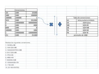 El documento presenta una tabla de conversiones entre unidades de almacenamiento digitales como bytes, kilobytes, megabytes, gigabytes, terabytes y petabytes. Luego enumera 10 problemas de conversión entre estas unidades para practicar, como convertir 165 gigabytes a megabytes, 1000 gigabytes a megabytes, 1000000 bytes a megabytes, y 251 kilobytes a bytes.