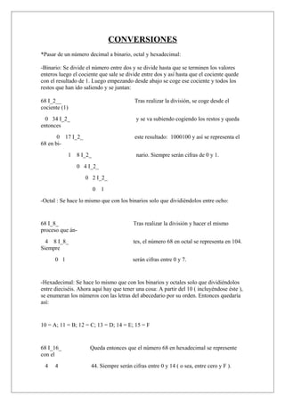 El documento explica cómo convertir números entre diferentes sistemas de numeración como binario, octal, hexadecimal y decimal. También cubre cómo representar números negativos usando diferentes métodos como módulo y signo, complemento a 1 y complemento a 2. Finalmente, introduce cómo representar números en coma flotante usando signo, exponente y mantisa.