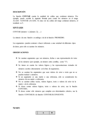 Este documento proporciona descripciones y ejemplos del uso de varias funciones estadísticas en Excel, incluidas CONTAR, CONTARA, MAX, MIN, MEDIANA y MODA.UNO. Explica qué hace cada función, su sintaxis y observaciones importantes sobre su uso. También incluye ejemplos con fórmulas y resultados para ilustrar cómo aplicar estas funciones a conjuntos de datos.