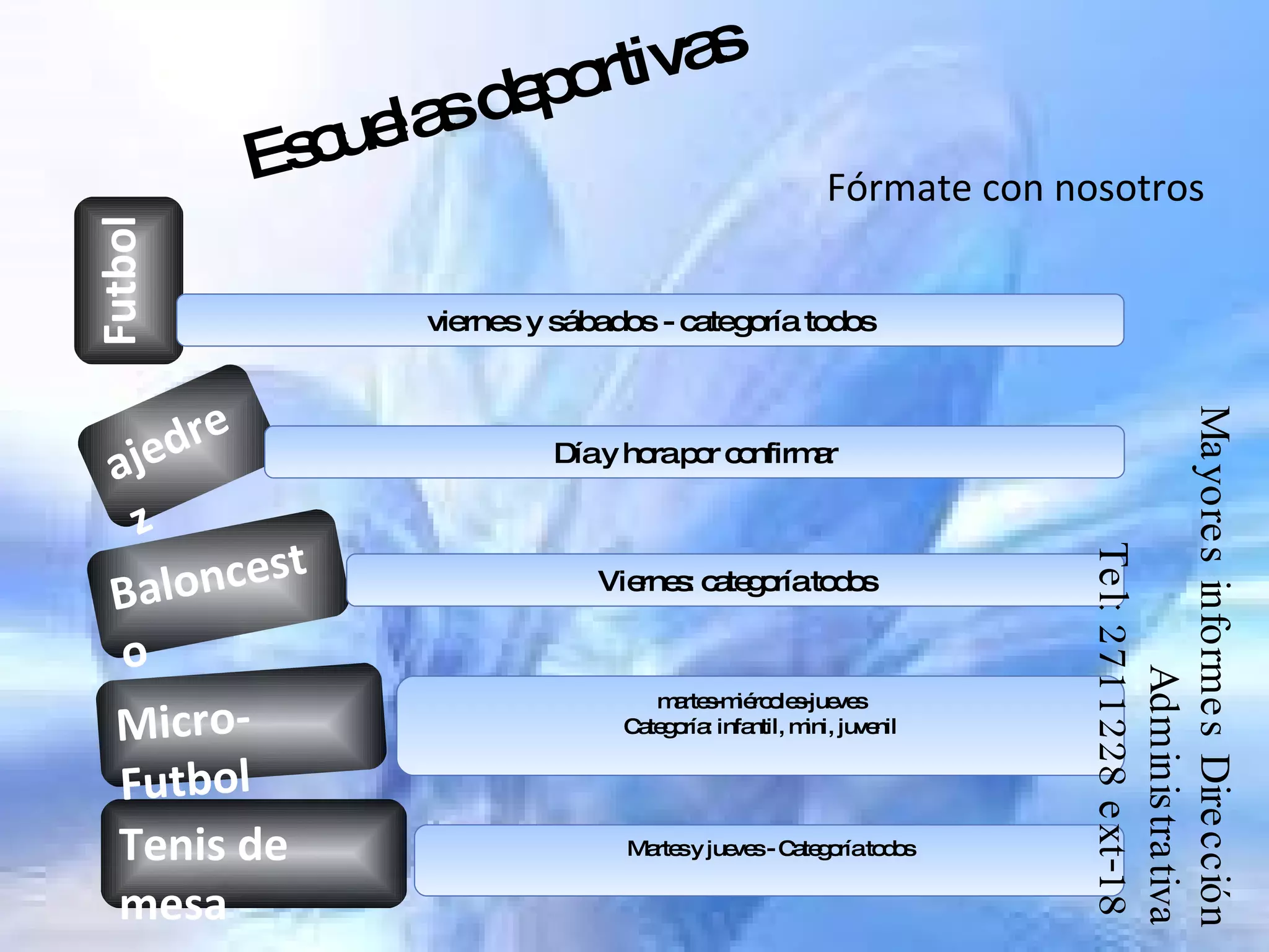Este documento anuncia las escuelas de formación musical y deportivas de una institución, incluyendo los días y horarios de las clases de cuerdas, vientos y percusión musical los lunes y miércoles, así como los deportes de fútbol, tenis de mesa, microfútbol, baloncesto y ajedrez los viernes, sábados y entre semana. Se provee la información de contacto para obtener más detalles.