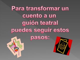 El documento proporciona instrucciones para adaptar un cuento a una obra de teatro dividiéndolo en 5 pasos: 1) identificar los personajes, 2) marcar los elementos de ambientación, 3) señalar las acciones y gestos de los personajes, 4) dividir la historia en actos basados en sucesos completos, y 5) redactar los diálogos a partir del texto original.