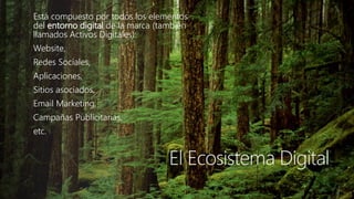 El documento habla sobre la estrategia digital y cómo construir una presencia en línea efectiva. Explica que el ecosistema digital incluye varios activos como el sitio web, redes sociales y aplicaciones. También describe cómo desarrollar un plan o roadmap para implementar la estrategia digital y lograr objetivos de alcance, crecimiento, interacción y conversión. Además, discute la importancia de crear una relación con los usuarios y mantener la relevancia de la marca para la comunidad en línea.