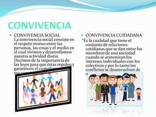 La convivencia social implica el respeto mutuo y la regulación mediante leyes para garantizar las relaciones armoniosas entre individuos diversos. La educación juega un papel crucial en promover una convivencia pacífica, enfatizando el diálogo y el respeto como bases para resolver conflictos y mejorar interacciones. Además, la convivencia con la naturaleza es esencial para la supervivencia humana, aunque la realidad actual exige una reflexión sobre el daño al planeta.