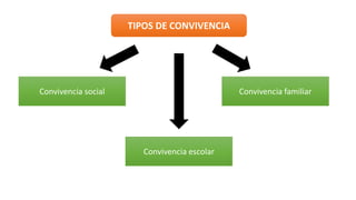 La convivencia se refiere a vivir en compañía y armonía con otras personas. Existen diferentes tipos de convivencia como la social, escolar y familiar. La convivencia social implica el respeto mutuo entre las personas y su entorno, y se fortalece a través de la educación, el respeto, la tolerancia y la concertación, mientras que se debilita por el individualismo, las agresiones, la criminalidad y la discriminación.