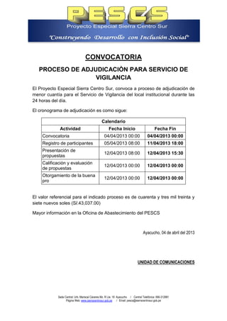 Se convoca a un proceso de adjudicación menor para el servicio de vigilancia del local institucional del proyecto especial sierra centro sur, que funcionará las 24 horas. El cronograma incluye el registro de participantes desde el 5 hasta el 11 de abril de 2013, la presentación de propuestas el 12 de abril y el otorgamiento de la buena pro en la misma fecha. El valor referencial del proceso es de S/. 43,037.00 y se puede obtener más información en la oficina de abastecimiento del PESCs Ayacucho.