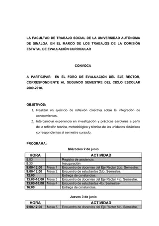 La Facultad de Trabajo Social de la Universidad Autónoma de Sinaloa convoca a un foro de evaluación curricular para reflexionar sobre la integración de conocimientos y compartir experiencias en prácticas escolares. Las actividades se llevarán a cabo del 2 al 4 de junio de 2010, incluyendo mesas para docentes y estudiantes de diferentes semestres, así como la entrega de constancias. Se establecen bases para la participación que incluyen requisitos para los informes y exposiciones de los grupos involucrados.