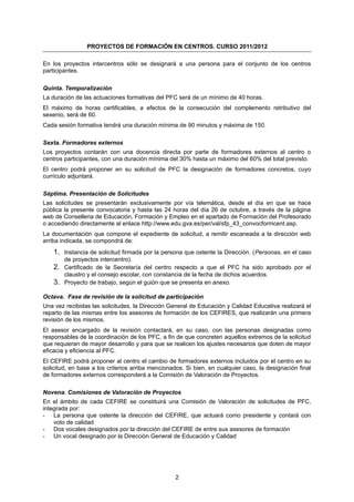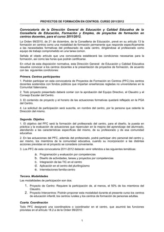 Este documento describe los requisitos y procedimientos para la presentación de proyectos de formación en centros educativos para el curso 2011-2012 en la Comunidad Valenciana. Los centros pueden presentar proyectos individuales o intercentros para la formación de su profesorado. Las solicitudes serán evaluadas según criterios como la participación planificada y los objetivos de mejora. Los proyectos seleccionados recibirán formación y una certificación para el profesorado participante.