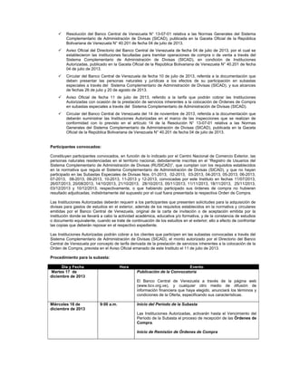 Este documento es una convocatoria del Banco Central de Venezuela para una subasta especial de divisas a través del Sistema Complementario de Administración de Divisas (SICAD) dirigida a personas naturales residentes en Venezuela. La subasta tendrá lugar el 17 de diciembre de 2013 por un monto total de USD 10 millones. Los participantes podrán comprar entre USD 500 y USD 2,500, en incrementos de USD 100. El proceso de subasta incluye el registro de órdenes de compra del 18 al 19 de diciembre y la adjudicación y an