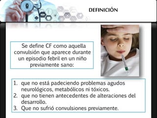 Este documento presenta una revisión sobre convulsiones febriles. Define las convulsiones febriles como aquellas que ocurren durante un episodio febril en niños previamente sanos. Afectan hasta el 4% de los niños entre 6 meses y 6 años. Las clasifica como convulsiones febriles simples, que son generalizadas y duran menos de 15 minutos; o complejas, que son focales, duran más de 15 minutos o se repiten en 24 horas. Explica las posibles causas como factores químicos, virales, genéticos o e