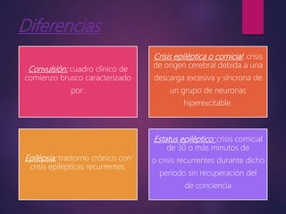 Este documento describe las convulsiones febriles en niños. Define las convulsiones febriles como crisis asociadas con fiebre en ausencia de infección del sistema nervioso central o desequilibrio electrolítico en niños mayores de un mes. Explica que las convulsiones febriles son comunes en niños de 3 meses a 5 años y que su fisiopatología involucra factores como aumento de toxinas e inmadurez del cerebro. Describe la clasificación, diagnóstico, tratamiento y recomendaciones para padres sobre las