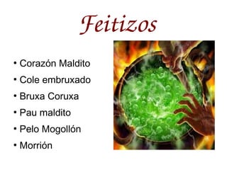 Este documento contiene una lista de ingredientes y hechizos para la noche de Samhain. Incluye partes de dragones, leones, sapos, grillos, serpientes y vino para realizar hechizos como hacer que los malos pierdan el corazón, hacer caer el cabello de la próxima cosecha, preparar pociones con sapos y grillos o convertir a alguien en un murciélago.
