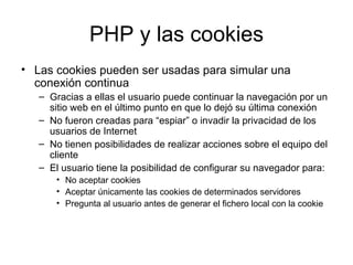 El documento explica qué son las cookies, cómo funcionan y cómo se usan en PHP. Las cookies son información que el servidor web envía al navegador del usuario para almacenar datos sobre la sesión o preferencias. En PHP se usa la función setcookie() para crear cookies y variables globales como $HTTP_COOKIE_VARS para acceder a los valores de las cookies del usuario.