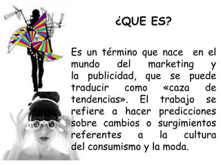 Coolhunting es un término que se refiere a predecir cambios en la cultura del consumo y la moda mediante la recolección de información sobre tendencias emergentes. Surge en los 90 para ayudar a las marcas a conectar con públicos específicos identificando valores sociales únicos. Los coolhunters, también conocidos como cazadores de tendencias, observan la vida cotidiana y las redes sociales para detectar nuevos productos, estilos y modos de vida.