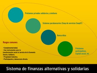 Coop57 es una cooperativa de servicios financieros que ofrece préstamos y ahorros a entidades de la economía social y solidaria. Funciona bajo principios de democracia, transparencia y desarrollo local. Sus socios son cooperativas, asociaciones y personas físicas que comparten sus valores éticos y solidarios. Coop57 financia proyectos socialmente útiles en áreas como el empleo, el medio ambiente y la cultura.