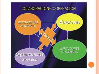 El documento habla sobre la cooperación internacional. Define la cooperación internacional como la ayuda voluntaria de un país donante a otra población en otro país. Los ámbitos de la cooperación internacional incluyen mejorar la salud, educación, condiciones ambientales y reducir desigualdades. Aunque originalmente se refería solo a ayuda al desarrollo, ahora también incluye elementos como promoción comercial e intereses políticos y económicos. Los principales tipos de cooperación son financiera, técnica, alimentaria, humanitaria, científica