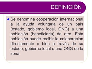 El documento describe los conceptos fundamentales de la cooperación internacional. Explica que es la ayuda voluntaria entre países y define sus orígenes después de la Segunda Guerra Mundial. Detalla los diferentes tipos de cooperación, como la bilateral, multilateral y a través de ONGs. También cubre los instrumentos, modalidades, principios y algunos de los organismos cooperantes más importantes como el Banco Mundial, BID, OMS y UNICEF.