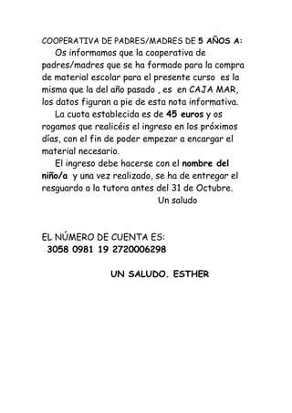La cooperativa de padres/madres para la compra de material escolar para el curso actual es la misma que el año pasado. La cuota es de 45 euros y se debe realizar el ingreso en los próximos días para poder encargar el material necesario antes del 31 de octubre, entregando el resguardo a la tutora.