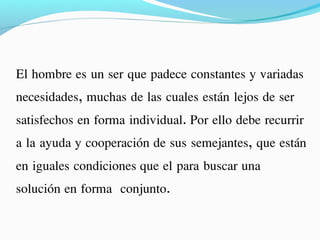 El documento describe los beneficios del trabajo en conjunto a través de cooperativas. Las cooperativas fomentan los vínculos sociales y generan un sentido de compromiso colectivo con la comunidad. Al unirse, las personas pueden brindar servicios a otros y trabajar hacia objetivos sociales y de bienestar común, no objetivos comerciales.