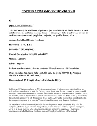 Este documento describe el origen y desarrollo del cooperativismo en Honduras. Comenzó a finales del siglo XIX con sociedades mutualistas y se formalizó con la primera ley de cooperativas en 1954. Actualmente hay alrededor de 1550 cooperativas en Honduras en sectores como agricultura, vivienda y ahorro y crédito, agrupadas en 6 federaciones y 1 confederación. El cooperativismo juega un papel importante en la economía y sociedad hondureñas.