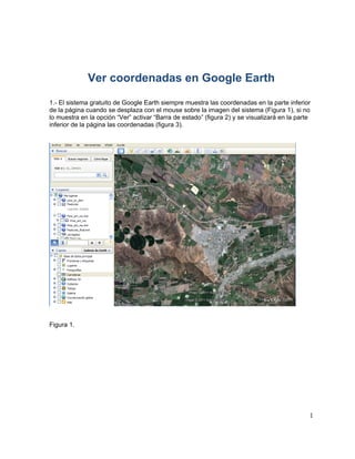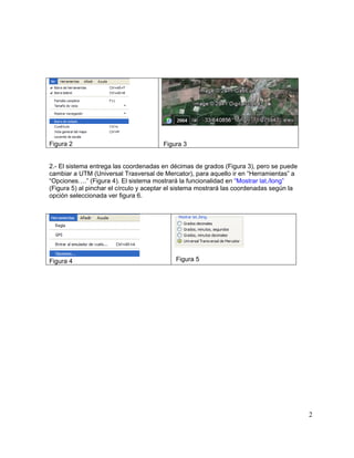 El documento explica cómo obtener coordenadas en Google Earth y cómo convertir entre diferentes formatos de coordenadas como grados decimales, UTM y grados-minutos-segundos. Detalla los pasos para visualizar y cambiar entre las opciones de coordenadas usando las herramientas y opciones del programa. Además, indica cómo ingresar las coordenadas obtenidas en Google Earth en el formato requerido para una plantilla apícola.