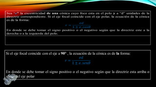 El documento presenta la geometría analítica plana enfocándose en el sistema de coordenadas polares, definiendo cómo se representa la posición de un punto en un plano mediante el par ordenado (r, θ). Se detallan transformaciones entre coordenadas polares y cartesianas, así como la clasificación de cónicas según su excentricidad. Además, se incluyen ejemplos prácticos y aplicaciones de estas transformaciones en geometría.