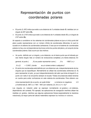 Las coordenadas polares son un sistema bidimensional para determinar cada punto de un plano mediante una distancia y un ángulo respecto a un origen. En coordenadas polares, un punto se representa como un par ordenado (r, θ), donde r es la distancia al origen y θ es el ángulo respecto al eje polar. A diferencia de las coordenadas cartesianas, en las polares un punto puede tener múltiples representaciones debido a que r y θ son periódicas.