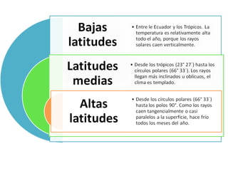 El documento explica los conceptos básicos de la localización geográfica absoluta utilizando el sistema de coordenadas geográficas de meridianos y paralelos. Define la latitud como la distancia angular desde el Ecuador, y la longitud como la distancia angular desde el meridiano de Greenwich. Explica que la combinación de latitud y longitud permite localizar cualquier punto en el globo. También describe los trópicos, círculos polares, hemisferios norte y sur.