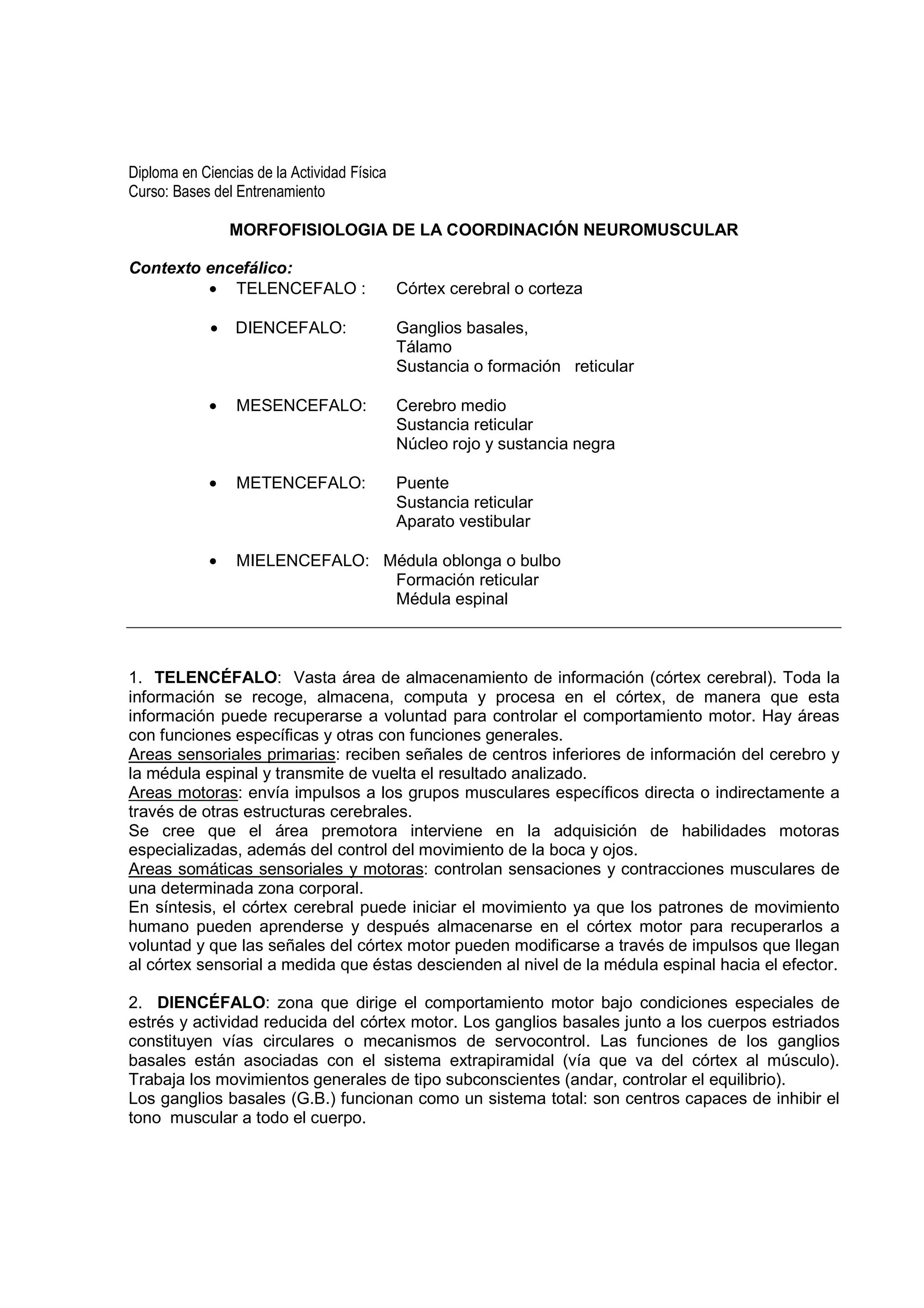 Este documento describe la morfología y fisiología de la coordinación neuromuscular en el sistema nervioso central. Explica las diferentes áreas del cerebro involucradas en la coordinación motora como el telencéfalo, diencéfalo, mesencéfalo, metencéfalo y mielencéfalo. También describe los receptores sensoriales, las vías neuronales ascendentes y descendentes y los tipos de reflejos involucrados en la coordinación motora.