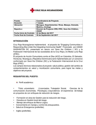 Se busca un coordinador/a de proyecto para un programa de 7 meses en Nicaragua enfocado en la respuesta comunitaria al Zika, financiado por USAID en asociación con Save the Children y la Cruz Roja. El candidato deberá tener formación en gestión de riesgos, experiencia en proyectos de preparación para desastres y habilidades interpersonales, y coordinará actividades con diversas instituciones y la comunidad. El contrato iniciará el 22 de marzo de 2017 y finalizará el 30 de septiembre de 2017.
