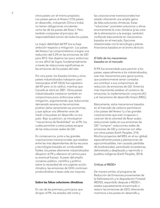 El fracaso del Protocolo de Kioto se debió a compromisos de reducción de emisiones poco ambiciosos, así como a la oposición de países industrializados que utilizaron mecanismos de flexibilidad y soluciones de mercado que no abordaron las causas del cambio climático. Las falsas soluciones planteadas por países del norte y corporaciones transnacionales, como la geoingeniería y la agricultura climáticamente inteligente, han sido criticadas por desviar la atención de las verdaderas causas del calentamiento global. Se enfatiza que una solución real al cambio climático debe basarse en el principio de 'responsabilidades comunes pero diferenciadas' y en un desarrollo sostenible y equitativo que priorice las necesidades humanas por encima del lucro.