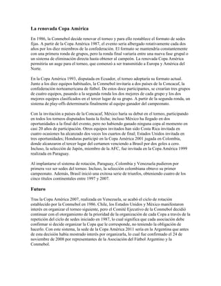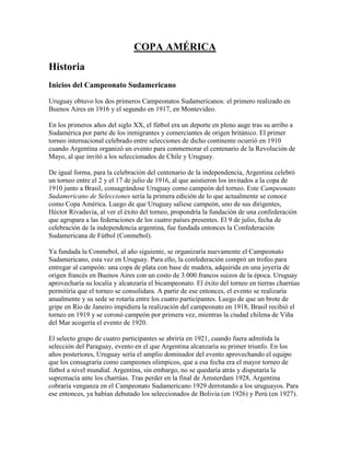 La Copa América es el campeonato de fútbol más antiguo del mundo. Se inició en 1916 como Campeonato Sudamericano y fue ganada por Uruguay en sus primeras dos ediciones. En 1917 se fundó la CONMEBOL. A lo largo de los años se fueron sumando más selecciones de Sudamérica y países invitados. En la actualidad participan 10 selecciones de la CONMEBOL y dos invitadas.