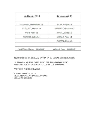 Tres equipos fueron reemplazados en la Copa Argentina. Rezono FC se retiró y fue reemplazado por Los Redondos. La Troncal fue expulsada por no presentarse y Los Troncos tomaron su lugar. Tres partidos deben reprogramarse con los nuevos equipos: Susso vs Los Troncos, Villa Federal vs Los Redondos, y Chelsi vs Los GDS.