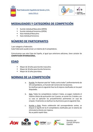 La XVI Copa de España Internacional de Karate se celebrará el 4 de noviembre en Santa Cruz de la Palma, Islas Canarias. Habrá competiciones de kumite individual masculino y femenino, y kata individual masculino y femenino. Los participantes deben estar afiliados a una federación autonómica y cumplir con los requisitos de edad, protecciones homologadas y seguro médico. El documento proporciona detalles sobre inscripciones, normas, sorteos y hoteles.