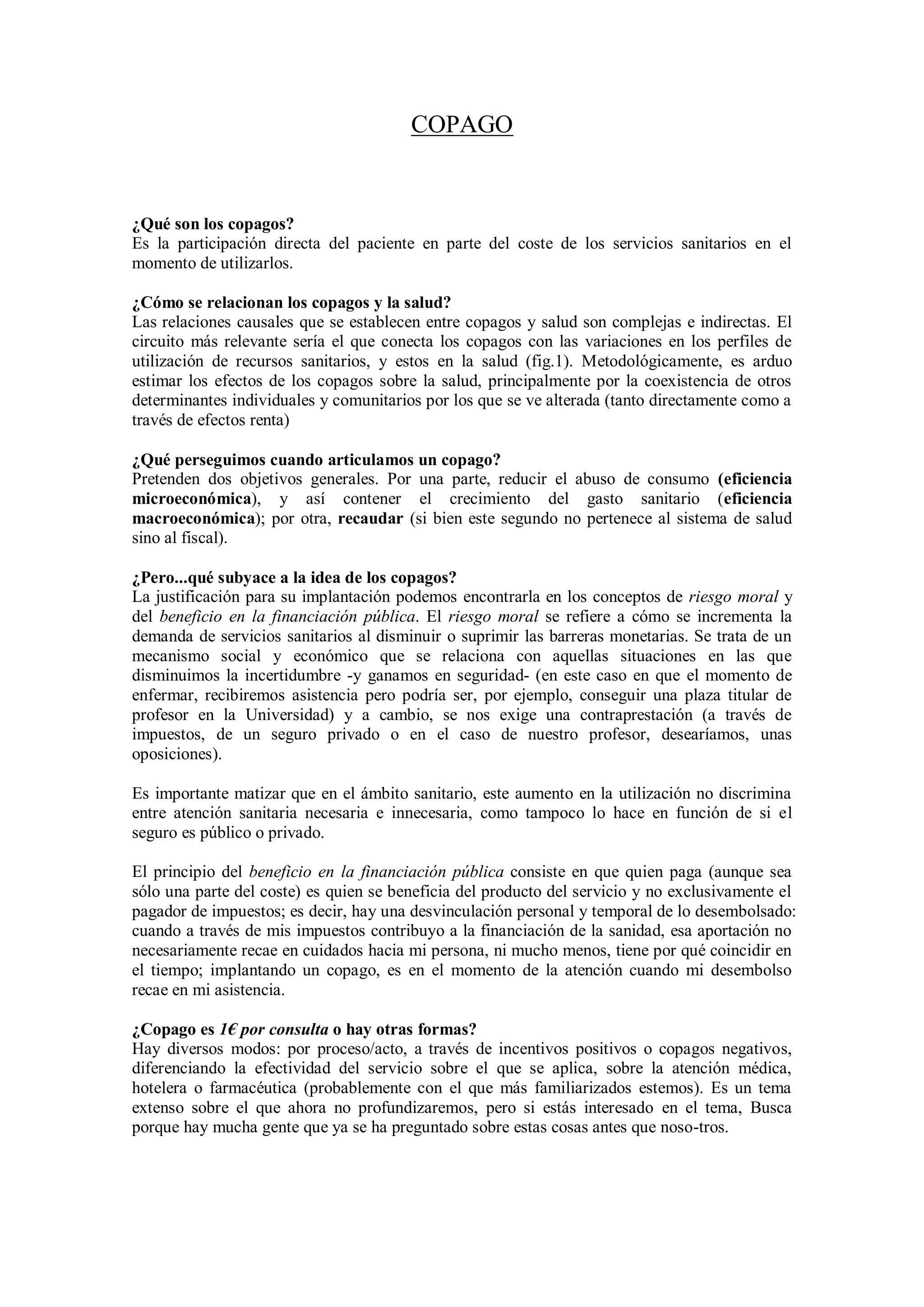 Los copagos buscan reducir el consumo de servicios sanitarios y contener el gasto, pero tienen efectos adversos como alterar la equidad y el acceso. La evidencia sugiere que no logran su objetivo de contener el gasto a largo plazo y pueden perjudicar el seguimiento de tratamientos crónicos. Existen alternativas como luchar contra el fraude fiscal, dirigirse a los proveedores e implementar copagos selectivos modulados por necesidad médica.