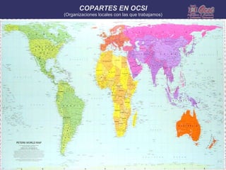 El documento lista las organizaciones locales con las que trabaja OCSI (Organizaciones con las que trabaja OCSI) en varios países de América Latina, incluyendo Guatemala, Nicaragua, Venezuela, Colombia, Ecuador y Perú. Proporciona información sobre cada organización como su ámbito de actuación, proyectos realizados con OCSI, y enlaces de internet cuando están disponibles. También detalla la participación de voluntarios de OCSI en cada organización.