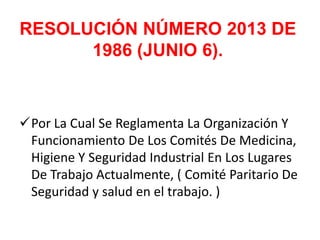 La resolución establece que todas las empresas e instituciones con 10 o más trabajadores deben conformar un Comité Paritario de Salud Ocupacional (COPASST) y aquellas con menos de 10 trabajadores deben nombrar un Vigía Ocupacional. El COPASST es encargado de promover y vigilar las normas de seguridad y salud en el trabajo, y está conformado por representantes de los trabajadores y la administración. Las empresas que no conformen el COPASST están sujetas a multas de hasta 500 salarios mínimos.