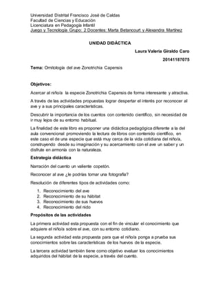Este documento presenta una unidad didáctica sobre la ornitología del ave Zonotrichia Capensis. Los objetivos son acercar a los niños a esta especie de forma interesante para despertar su interés por sus características principales y descubrir la importancia de los cuentos científicos. La estrategia didáctica incluye la narración de un cuento sobre el ave, actividades de reconocimiento del ave, su hábitat, huevos y nido, con el fin de vincular los conocimientos con el entorno de los niños