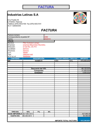 El documento es una factura emitida por Industrias Latinas S.A. a la empresa Mayoristas Reunidos por la venta de 300 unidades de modelo X por un total de 612,340.80 euros después de aplicar un descuento del 10% y añadir cargos por transporte y embalaje.