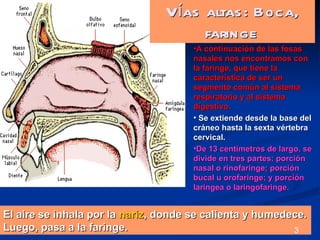 El documento describe el proceso de la respiración desde la entrada del aire por la nariz y boca hasta los pulmones, pasando por la faringe, laringe, tráquea y bronquios hasta llegar a los alvéolos pulmonares donde ocurre el intercambio gaseoso. Explica que la inspiración y espiración permiten que el oxígeno entre en los pulmones y el dióxido de carbono salga, gracias a los movimientos del diafragma y costillas.