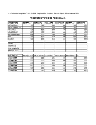 Este documento proporciona una tabla con 20 productos, sus precios y tipos de promoción. Se pide encontrar el descuento de cada producto según las promociones y una tabla de porcentajes, y colocar el detalle de promoción según el tipo.