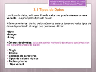 Este documento describe los conceptos básicos de manipulación de datos en Visual Basic, incluyendo tipos de datos, variables, constantes, operadores, procedimientos, estructuras de control, colecciones de objetos, arreglos y las instrucciones SQL básicas. También cubre cómo enlazar una base de datos mediante ActiveX Data Objects.