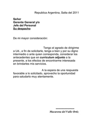 Macarena del Valle Ortiz está solicitando un puesto de trabajo y adjunta su currículum vitae. Ha estudiado en escuelas primarias y secundarias en Salta y completó el primer año de la carrera de Administración de Empresas. Tiene experiencia trabajando en boutiques, cuidando niños, y en ventas mayoristas. Proporciona detalles sobre su educación, antecedentes laborales, habilidades y datos personales para respaldar su solicitud.