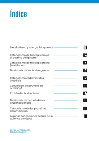 El documento resume varias rutas metabólicas importantes. La primera sección describe el catabolismo de triacilgliceroles, incluida la hidrólisis que produce glicerol y ácidos grasos, y la β-oxidación de los ácidos grasos. Otras secciones cubren la biosíntesis de ácidos grasos, la glucólisis, la conversión de piruvato en acetil CoA, el ciclo del ácido cítrico, la gluconeogénesis y el catabolismo de proteínas a través de la desaminación.
