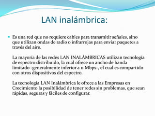 La red LAN inalámbrica utiliza ondas de radio o infrarrojas en lugar de cables para transmitir señales entre dispositivos. Ofrece ventajas de movilidad sobre las redes LAN convencionales, pero generalmente tiene un ancho de banda más limitado. Las redes LAN inalámbricas son útiles para empresas en crecimiento al proporcionar conectividad sin problemas y fácil configuración.
