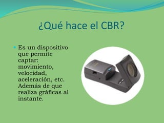 El documento describe las funciones del CBR, un dispositivo que captura movimiento y velocidad. Explica conceptos como oscilación, frecuencia, período y amplitud relacionados con el movimiento pendular. Presenta fórmulas para calcular velocidad y aceleración de un péndulo. Además, resume cuatro leyes del movimiento pendular y concluye que el uso de tecnología como el CBR puede facilitar el aprendizaje de matemáticas de manera más dinámica y transversal entre asignaturas.