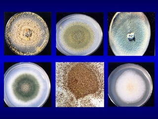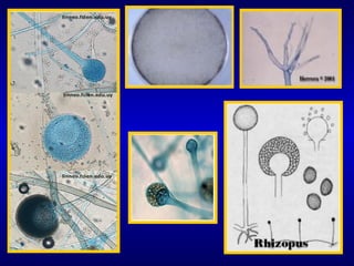 El documento trata sobre las micosis oportunistas causadas por los hongos Aspergillus spp. y los hongos del género Mucorales. Aspergillus fumigatus, A. niger, A. terreus y A. flavus son las especies de Aspergillus más patógenas para los humanos. Las infecciones por estos hongos incluyen aspergilosis pulmonar, diseminada y cutánea. La cigomicosis es causada por hongos como Rhizopus, Mucor y Absidia, y puede manifestarse como in