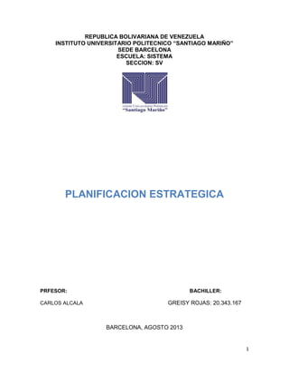 Este documento presenta una introducción a la planificación estratégica. Explica los orígenes de la planificación estratégica y describe diferentes enfoques como el enfoque estratégico corporativo, el enfoque estratégico situacional y el enfoque normativo-prospectivo. También detalla las etapas de la planificación estratégica e identifica tipos como las estrategias de integración, estrategias intensivas y estrategias de diversificación. Concluye enfatizando la importancia de la planificación y la ejecución para el des
