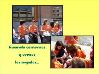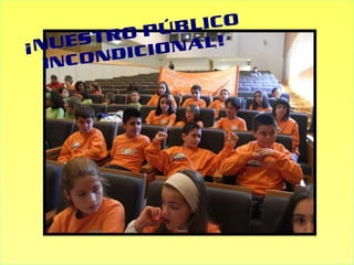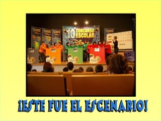 El documento describe la participación de un grupo en un concurso sobre música. El grupo disimuló sus nervios y fue recibido por los organizadores del concurso, cuya presentadora se llamaba Natalia. El tema del concurso era la música y el equipo pensó su respuesta mientras su profesora les daba ánimos. El público también participó en el concurso.