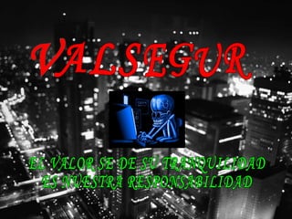 La empresa VALSEGUR S.L ofrece servicios de seguridad como vigilantes, cámaras de seguridad, alarmas y transporte de fondos. Realizó encuestas que mostraron que el 70% de empresas y 85% de hogares tienen sistemas de seguridad, aunque el 20-33% estarían dispuestos a contratar nuevos servicios por 20-100€ al mes. El plan de marketing incluye fijar precios competitivos, publicidad en radio, TV e internet, y distribución a través de canales mayoristas y minoristas.